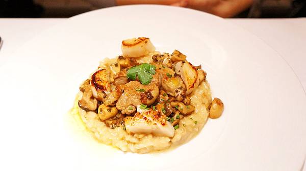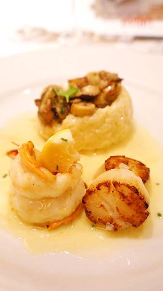 主菜: 干貝明蝦野菇燉飯,無可挑剔的一套燉飯,明蝦肉質結實有彈性且甘甜,干貝更不用說,燉飯軟硬適中,更難得的是米心保持在將熟未熟之際,是燉飯的最佳狀態。