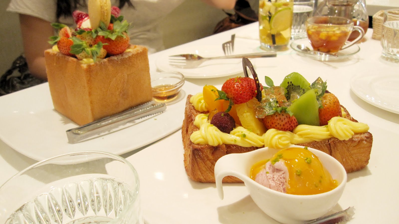 接下來就是主角們豋場,第一位是傳統土司做成的蜜糖土司,我們疑似是點了個什麼熱帶水果類的口味。土司本身應該是都一樣的,就是把整塊的cube形狀的土司,像棺材板一樣的作法,先把肚子裡的麵包挖起來,接著用做奶酥厚片的方法下去烤這些麵包,最後再把水果跟冰淇淋的topping淋上去。據說這個做法是店主在國外吃到學回來的,但我個人認為這是師法波特屋烤馬鈴薯的烹調方式(也是一樣開腸剖肚再淋上醬料)。致於味道如何,我不是很愛甜食,但個人覺得還挺好吃的,畢竟辛苦過後得到的果實總是特別甜美,請大家務必趕快去嚐嚐。(因為聽說排隊的情況已經大幅改善不要只有我像傻了一樣排那麼久啊啊啊~)