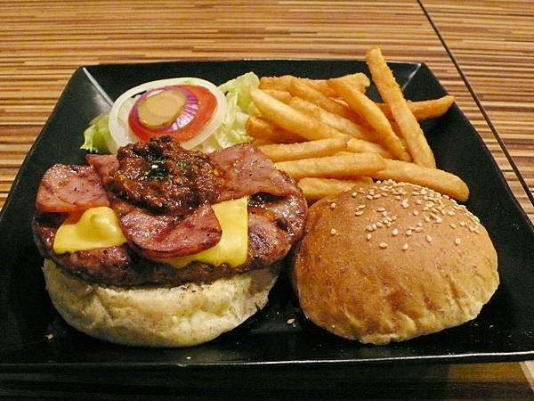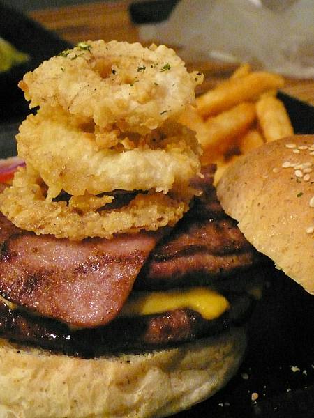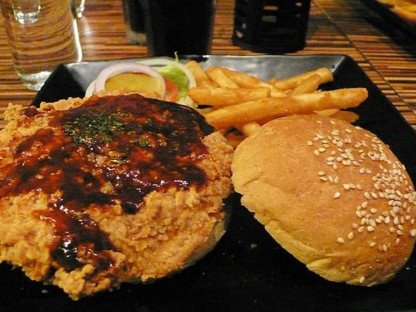 從開胃菜的泰式炸雞翅、side的炸薯條、身為漢堡肉的雞腿排到燒烤堡上的炸洋蔥圈,這家的炸物呈現的相當出色。端上桌的時候彷彿還可以聽到這些炸物麵衣上面逼哩逼哩的小聲響,這通常是只有鹹酥雞店才有的臨場感。咬下嘴候小聲響變成高分貝的喀滋喀滋,酥脆不膩的口感實為炸物中的上乘之作。牛肉的部分大約為六到七分熟,從表面菱格紋以及炭火味判斷應該是用木炭與烤架來烹調,香料跟鹽的平衡也作得很成功,搭配cheese及兩片厚厚的煙燻培根也不會太鹹。大口咬到底的時候牛肉的多汁、培根的香氣混著辣醬的刺激奔流在整個嘴巴裡,然後再湧上整個鼻腔,好吃的漢堡就是要有這樣狂野的滋味!