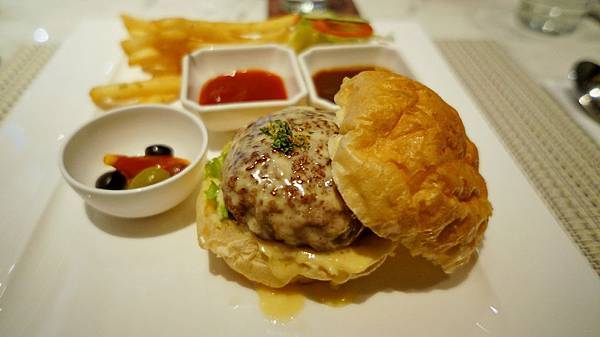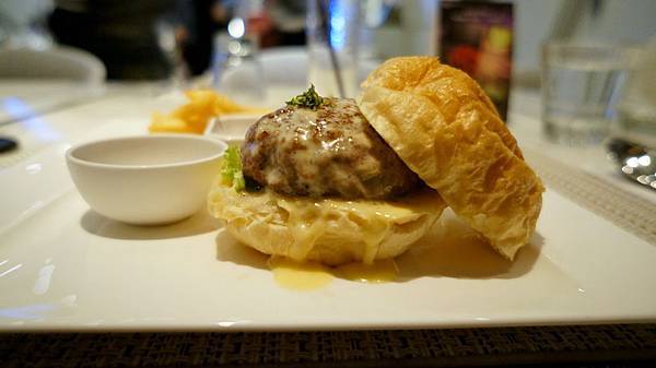 餐廳區的last order是十點,總算我跟外資金童有在大限之前點到餐。漢堡控如我當然就點了漢堡,金童點了櫻花蝦白醬義大利麵。之前在夜店點的漢堡大概跟麥當勞的吉士漢堡口味相去不遠還貴上8倍,但LMNT因為有分為兩區,所以餐廳區這邊有獨立廚房與廚師,做出來的餐點自然遠勝一般夜店。厚實七分熟的漢堡肉淋上特調濃厚cheese白醬,光香氣就先過了第一關;再來麵包的部分值得談一下,這邊用了很像丹麥吐司的多層次奶油做漢堡包,上次吃到這個作法是在紐約的漢堡名店Shake Shack(天哪這家實在好好吃我光想就要融化了)。但很遺憾是有點畫虎不成,麵包的筋性太強,咬下去的時候竟然像魔杖麵包一樣頑強的抵抗我齒列的拉扯,加上我有力的虎口握著剩下的漢堡,造成肉汁跟白醬大滴小滴滴滿盤,弄得有些狼狽。只能說這個麵包的嘗試是nice try,不過請供貨的麵包店再調整調整會更好。