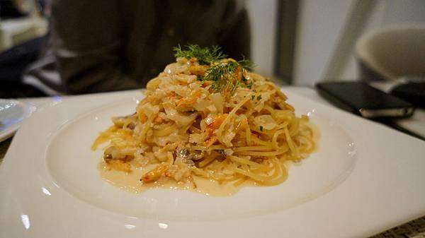 櫻花蝦白醬義大利麵也做得很好,麵條彈牙不硬,醬汁濃郁不膩。櫻花蝦的份量也足,更深得我心的是有很多的蒜頭,雖然要價300多塊稍嫌貴了一點,但考量到地點跟服務,整體來說也不會不合理。