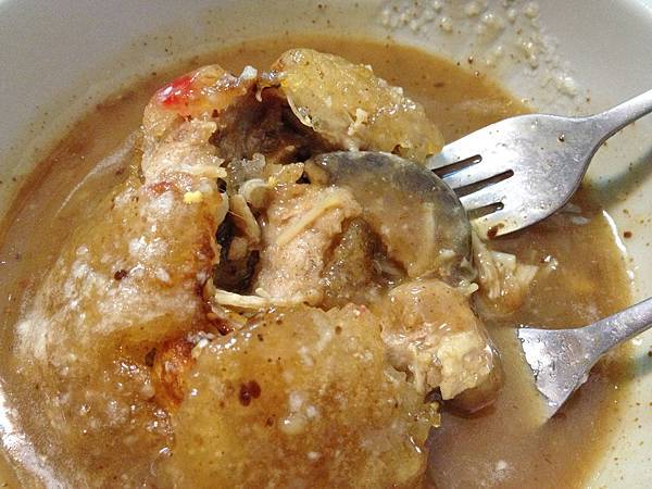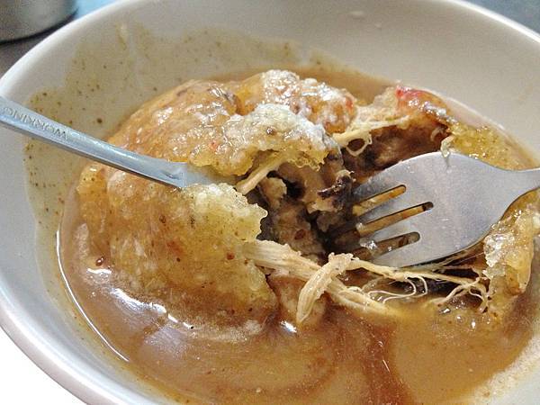 阿三的肉圓長得跟北門口一模一樣,連料也一模一樣。你可能會覺得肉圓料不都一樣?這可就大錯特錯!北門口跟阿三的肉圓都有分大小,所謂的大小不只是literally的大小,還有料的不同。大的肉圓裡面除了完整的肉塊(不是絞肉喔)以外,還有香菇、干貝跟半顆蛋。是的,是批著肉圓皮的粽子無誤。但其實台灣小吃很多都是這樣混搭,就像麻豆的碗粿也是批著碗粿皮的粽子,所以大家也不用太驚訝。而且這兩家還有一個大特色就是皮是脆的。一般的肉圓皮多半是軟的,但這兩家的皮彷彿用瓦斯槍炙燒過一樣是帶點微焦的酥脆口感,據說是裹了番薯粉再炸,相當的特別。