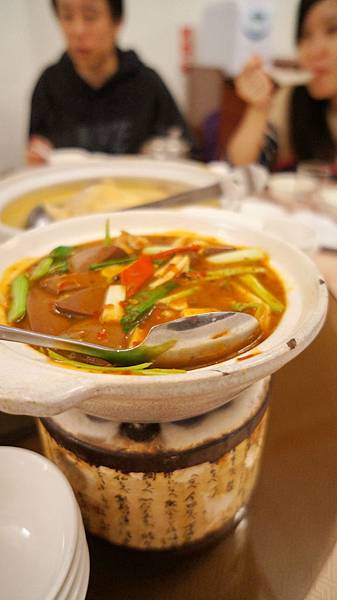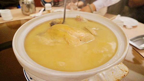 雞湯上桌的時候整鍋都還在大沸騰嗆著煙,服務生會先一人盛一碗湯讓大家試味道。這雞湯可不簡單,除了老母土雞以外還放了大量的豬腳跟金華火腿慢火細燉,整鍋湯已經逼出食材精華呈現乳白色,裝到碗裡都看不到碗底。一般雞湯表面的油膜也清除的很乾淨,因此入口不油膩。但因富含雞跟豬腳的膠質,所以喝完嘴裡還會有黏黏的感覺。雞肉雖然燉煮許久但並不會老,豬腳則是已經軟爛到入口即化。唯一的小缺點是有湯點鹹,不知道是火腿的關係還是鹽下太重。但整體而言已經是目前喝過數一數二的特極雞湯!