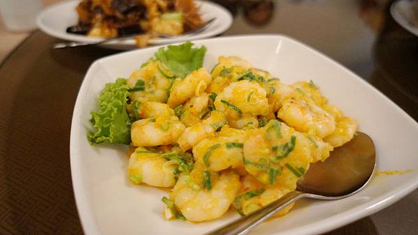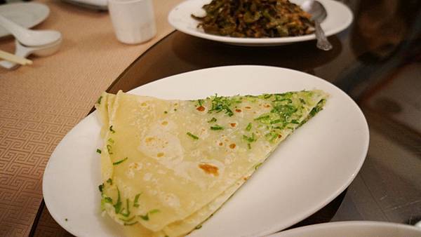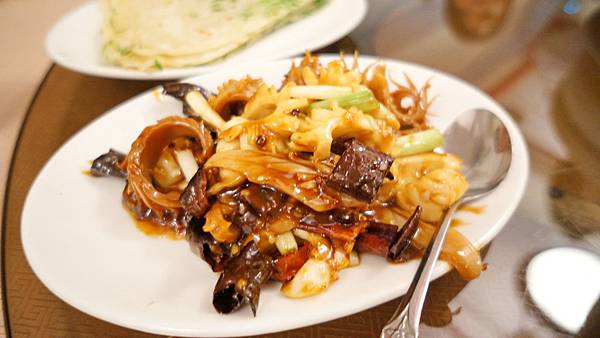 雖說是穿川菜館,但其實現在都很融合了,這次點菜也只有五更腸旺跟乾煸四季豆是比較正統川菜,其他像金沙蝦仁、醬爆雙魷、蔥油餅跟棗泥鍋餅這些就是常見的中華料理。菜色的火侯跟調味都做得很出色,但整體來說有些偏淡,大概是為了襯托雞湯的鮮甜,所以把菜的姿態放低,畢竟雞湯才是主角。