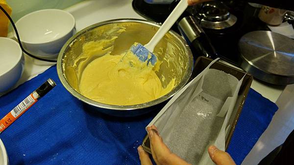 5. 倒進去鋪好烘培紙(Costco有)的長方形烤模,丟到烤箱裡烤個15分鐘後用刀在中間畫一條刀疤。