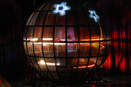 當時的鐵球沒有這麼高級,裡面飛馳機車很像隨時會破網而出似的。