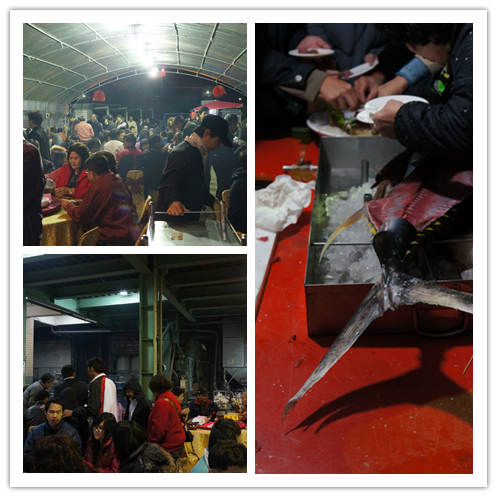 至於傳產的尾牙就不來這幾套,傳產是實業,老闆多半務實。什麼表演啦藝人啦都免了,就是讓大家吃好喝好準沒錯。像我去過的工廠尾牙是直接辦在廠房裡面,還沒開席大門口就擺了個攤子在切生魚片給大家吃,而且不是我們平常在壽司店料理亭裡看到處理好的生魚肉塊,是整‧隻‧的‧鮪‧魚‧有頭有尾超級大一隻!師父就像將太壽司裡的大年寺拿了一把好大的魚刀在支解這隻大魚。而且賓客也都老實不客氣,魚肉都還沒離開砧板放到冰塊盤上就已經有人用筷子或牙籤去插走,所以我傻傻的在冰盤前面等了三分鐘還沒有吃到半塊...